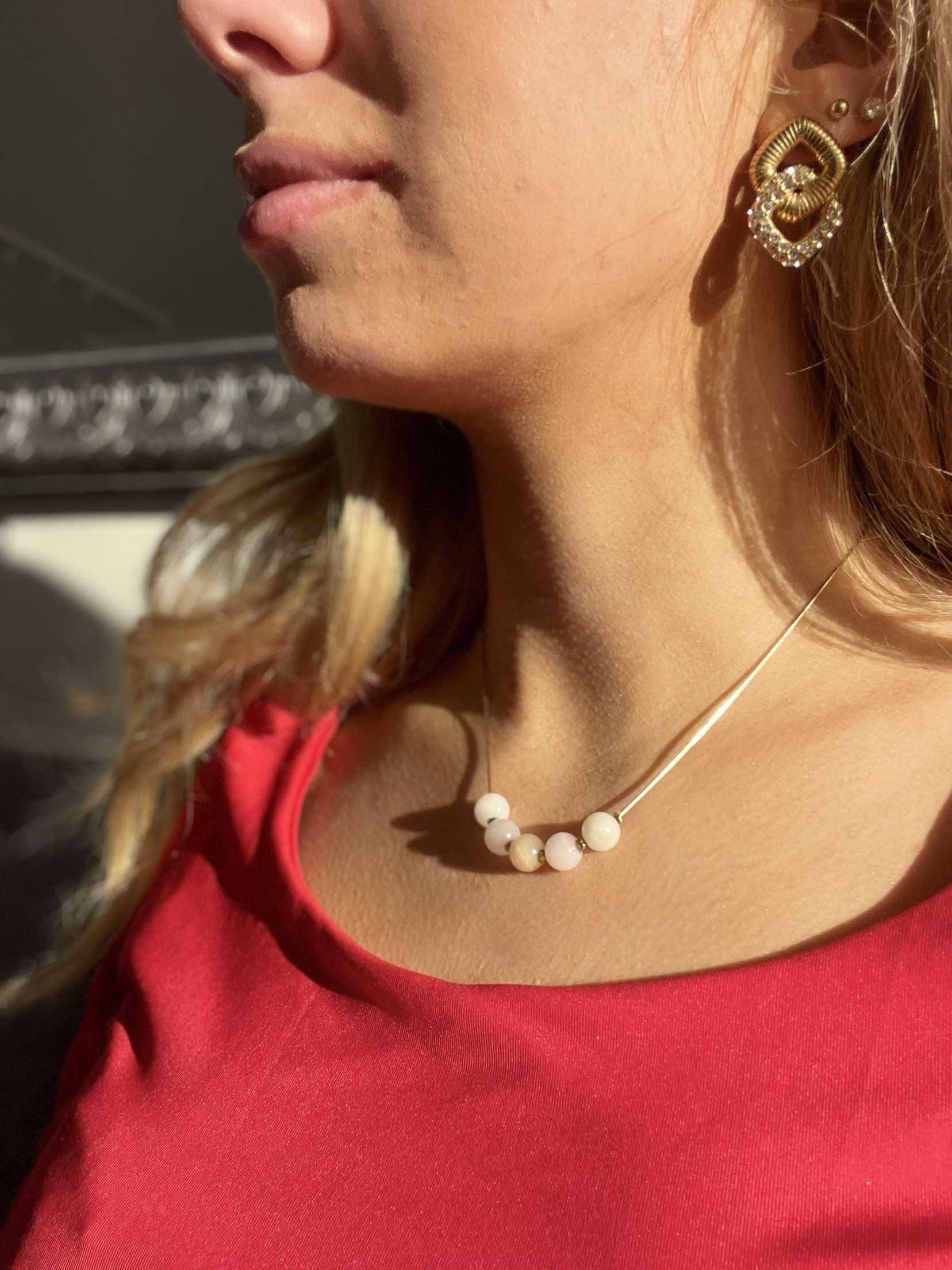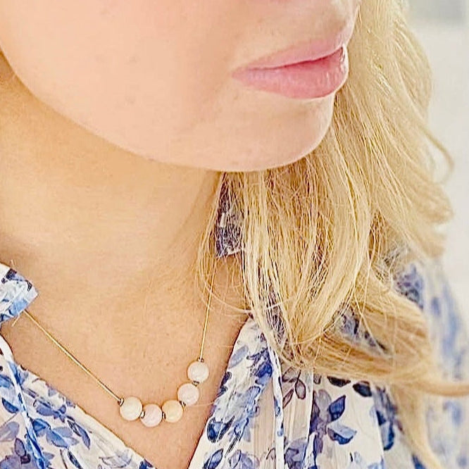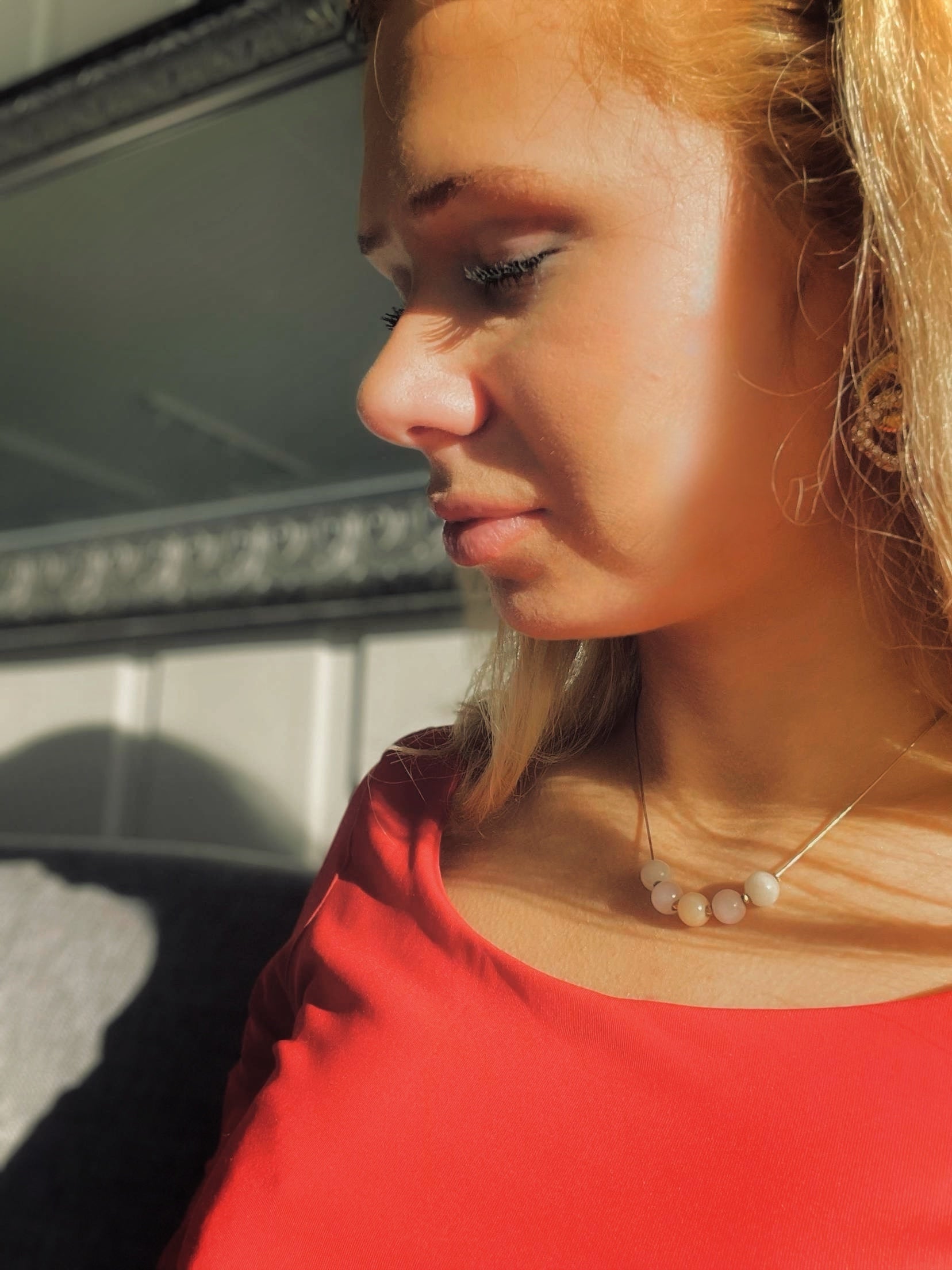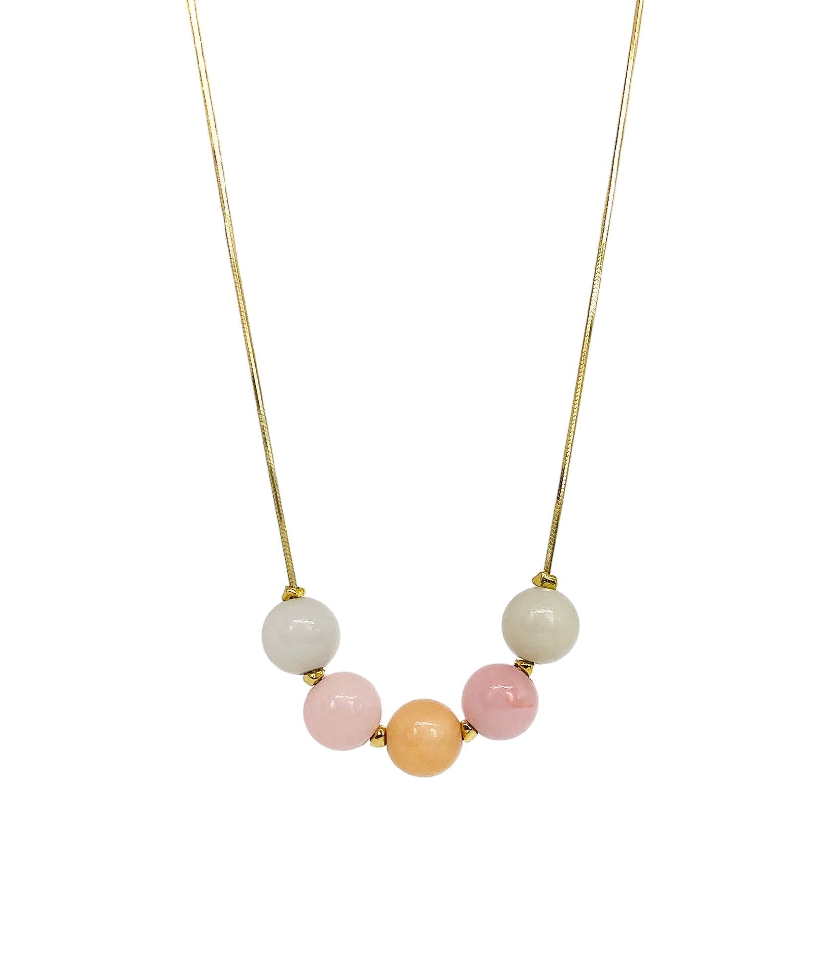 Bestående av vakre natursten-perler i jade, på slangekjede. Detaljer i sølv gir en fin kontrast til de runde pastell fargede stenene. Elegant og sommerlig.