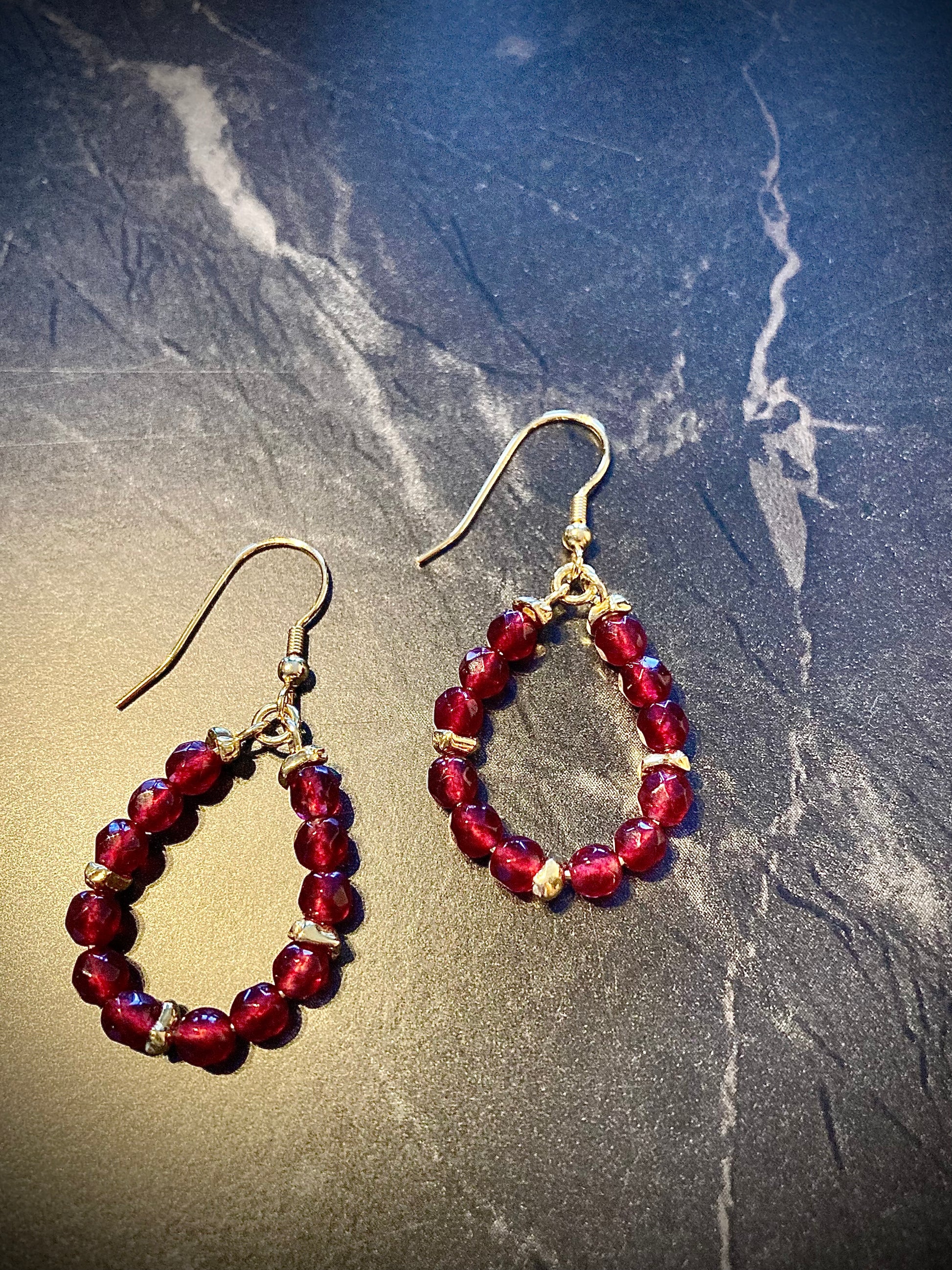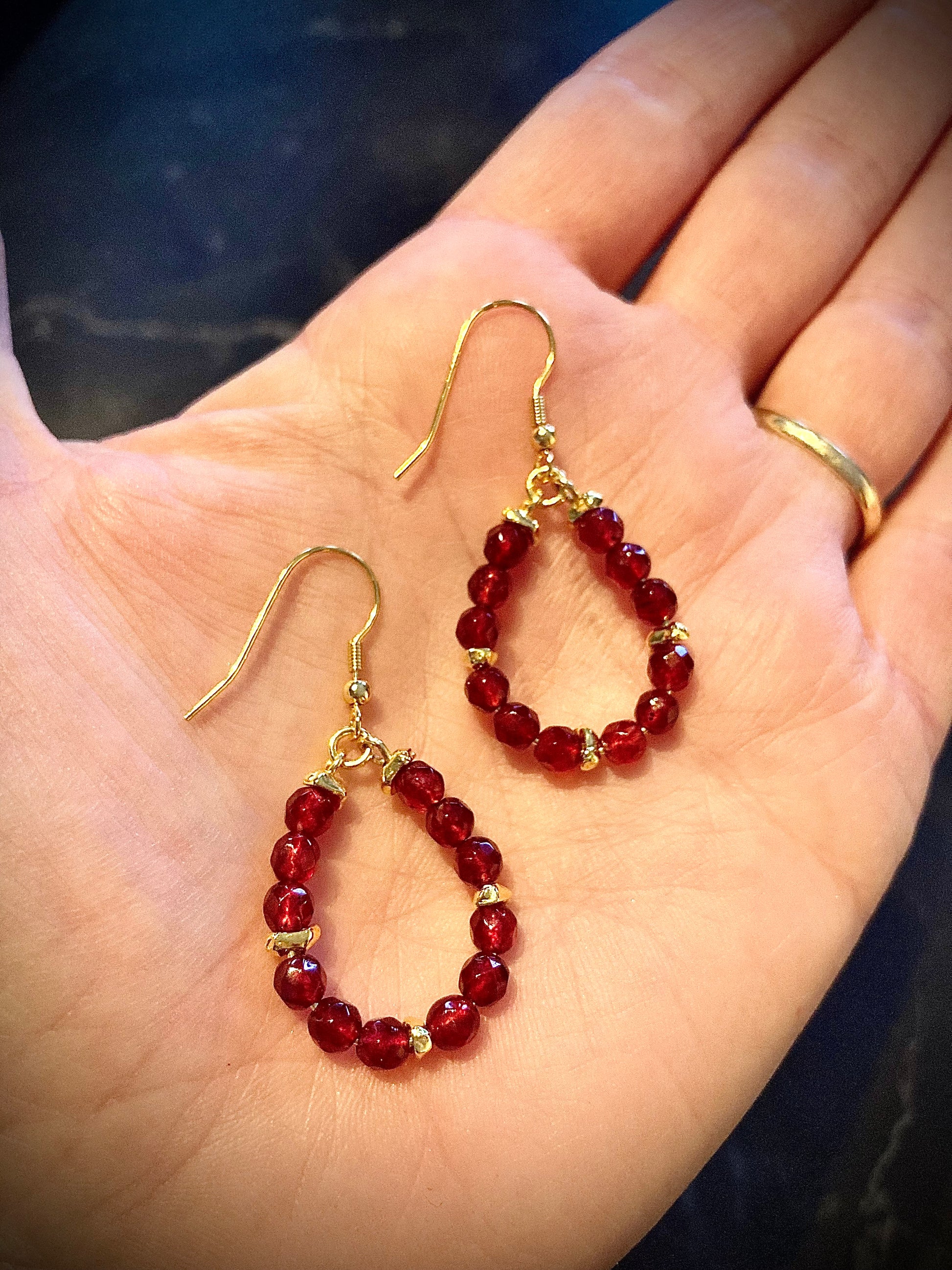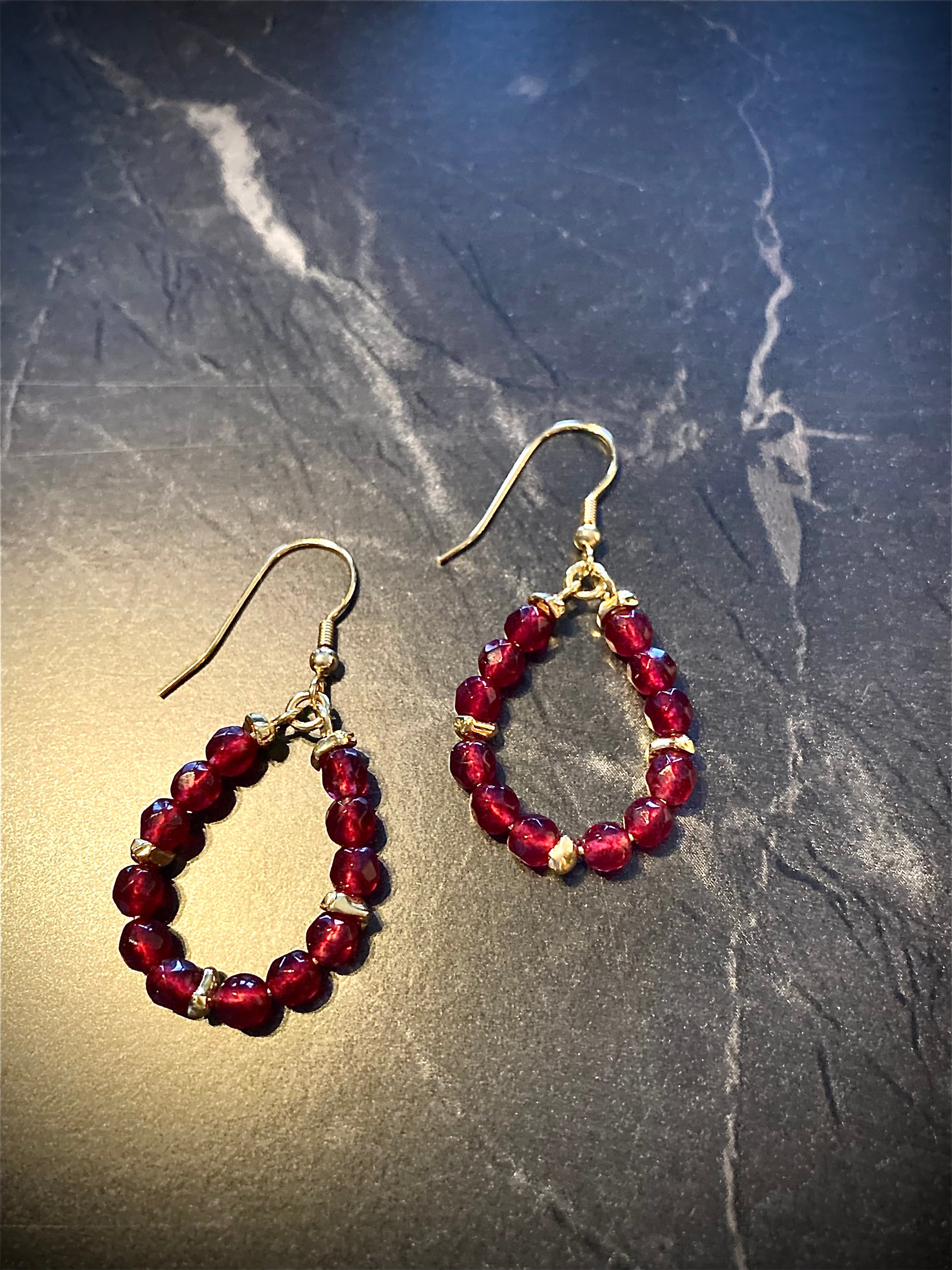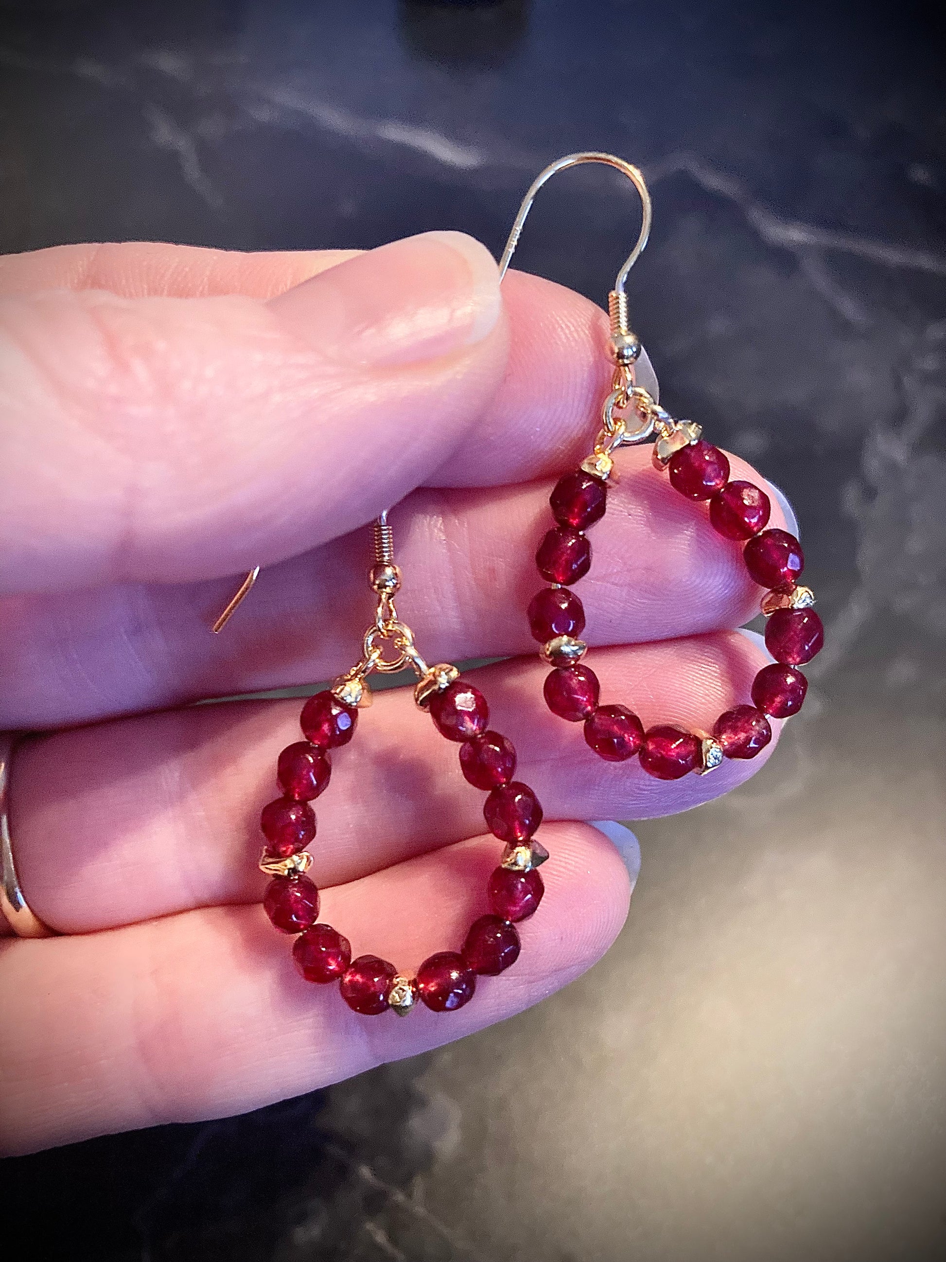 Elegante øredobber med fransk ørekrok i forgylt 925-sterlingsølv, pyntet med fasetterte burgunderrøde jadeperler i dråpeform. Superenkle å ta på.