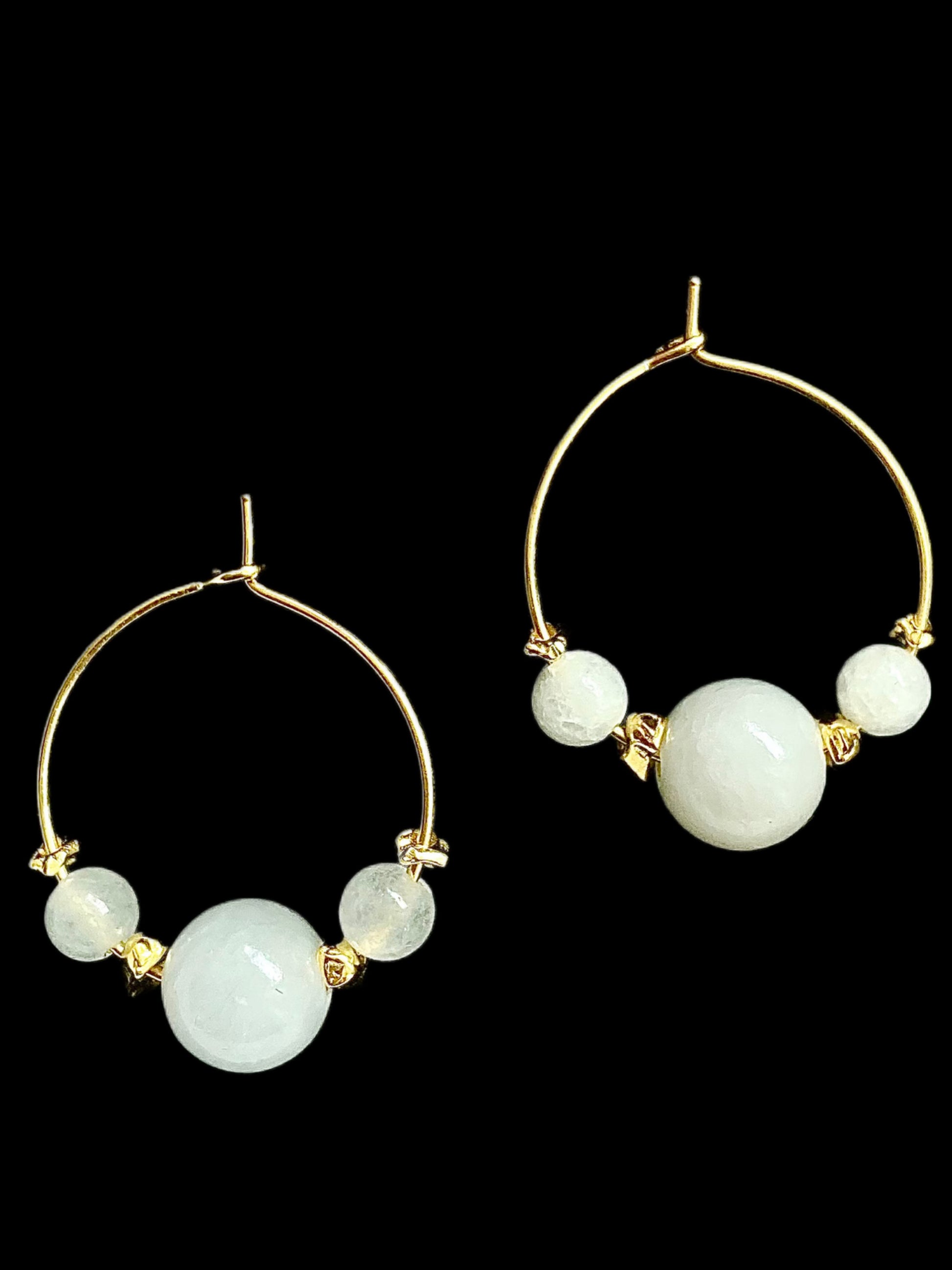 Kommer i hvite perler av jade eller rosa perler av jade. Hoops og sølvnuggets i forgylt sølv (925).